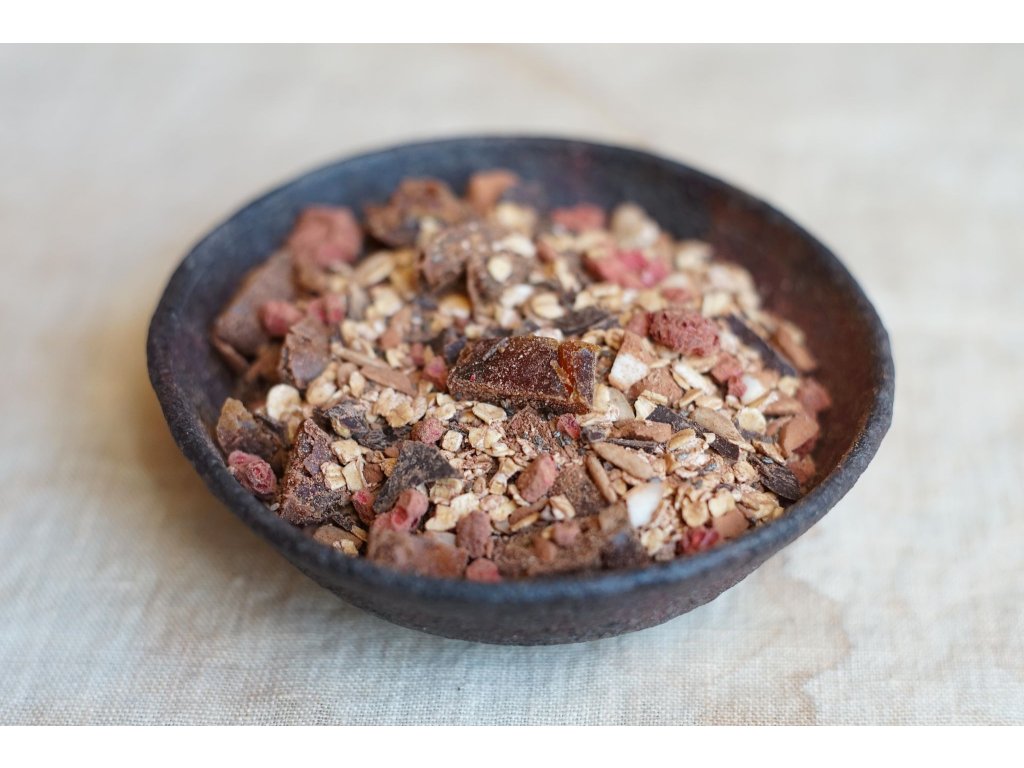 Ovesné vločky bezlepkové, chia semínka, kokosový cukr, kakaový prášek, datle, kokos, mandle, slunečnice, lyofilizované maliny, čokoláda, veganská půdní probiotika