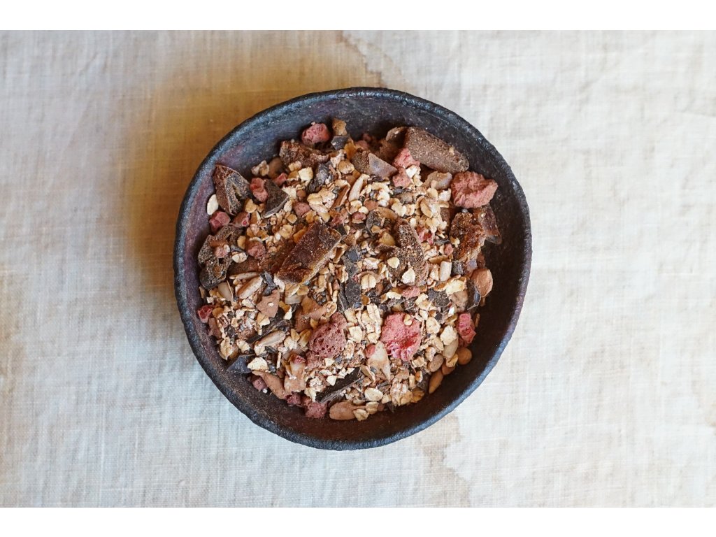 Semínkovo-oříšková směs s čokoládou, malinami a datlemi, na přípravu živého veganského jogurtu doma nebo kdekoli na cestě.