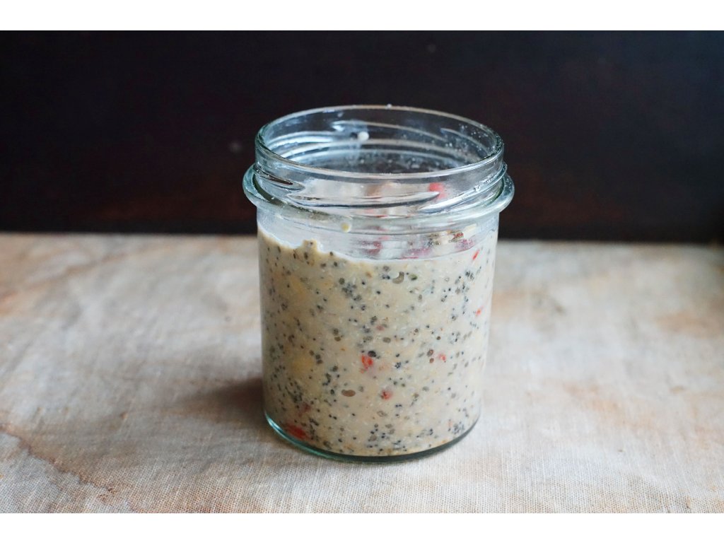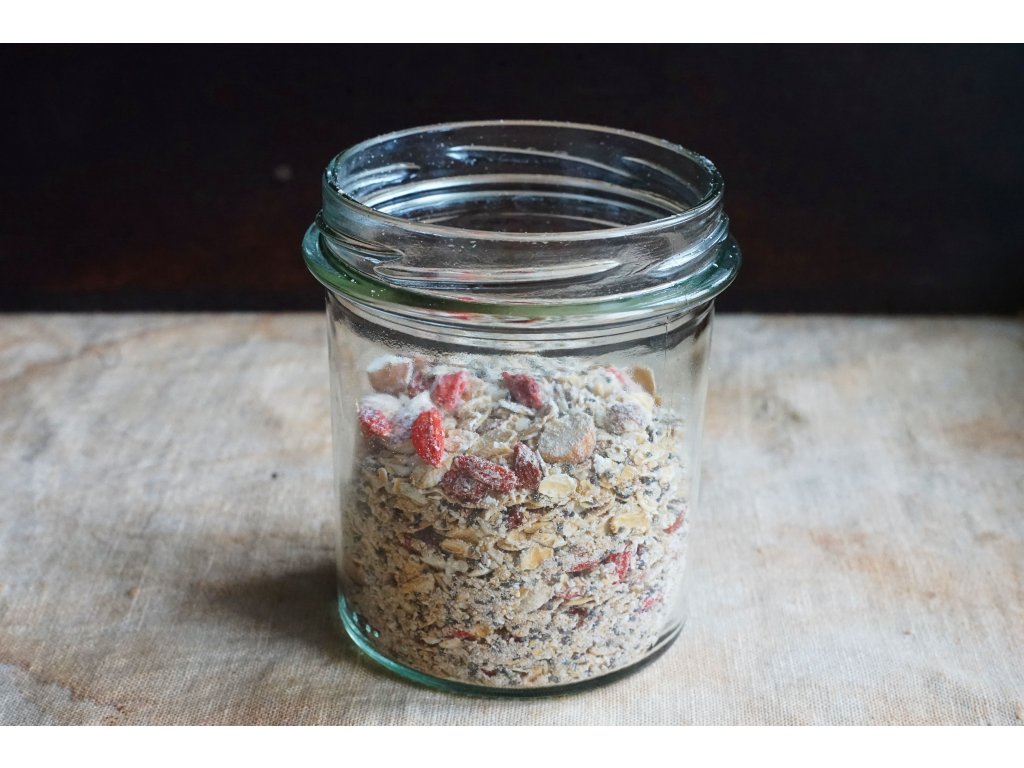 Směs ovesných vloček, semínek a sušených plodů je smíchaná s velmi kvalitním probiotickým práškem, stačí ji tedy jen zalít vodou a nechat přes noc nabobtnat a zaktivovat.